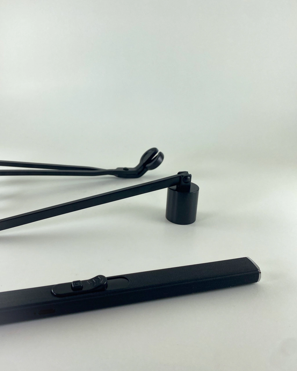 Este set esta compuesto por el apaga velas, la tijera corta pabilo y el encendedor por arco eléctrico recargable USB